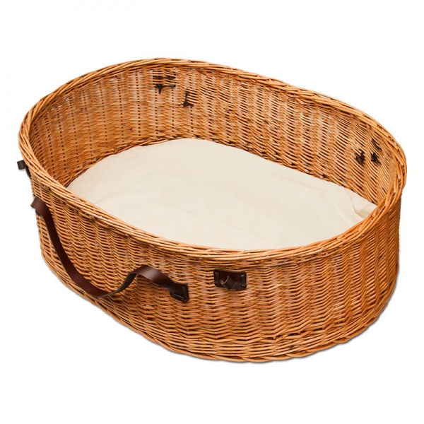 De Natural Large is vervaardigd van gevlochten wilgentwijgen en heeft een ovale vorm, waarin de natuurlijke houding van uw liggende huisdier gewaarborgd wordt. Het model Natural wordt standaard geleverd met lederen handgrepen en is altijd voorzien van een zacht matrasje.